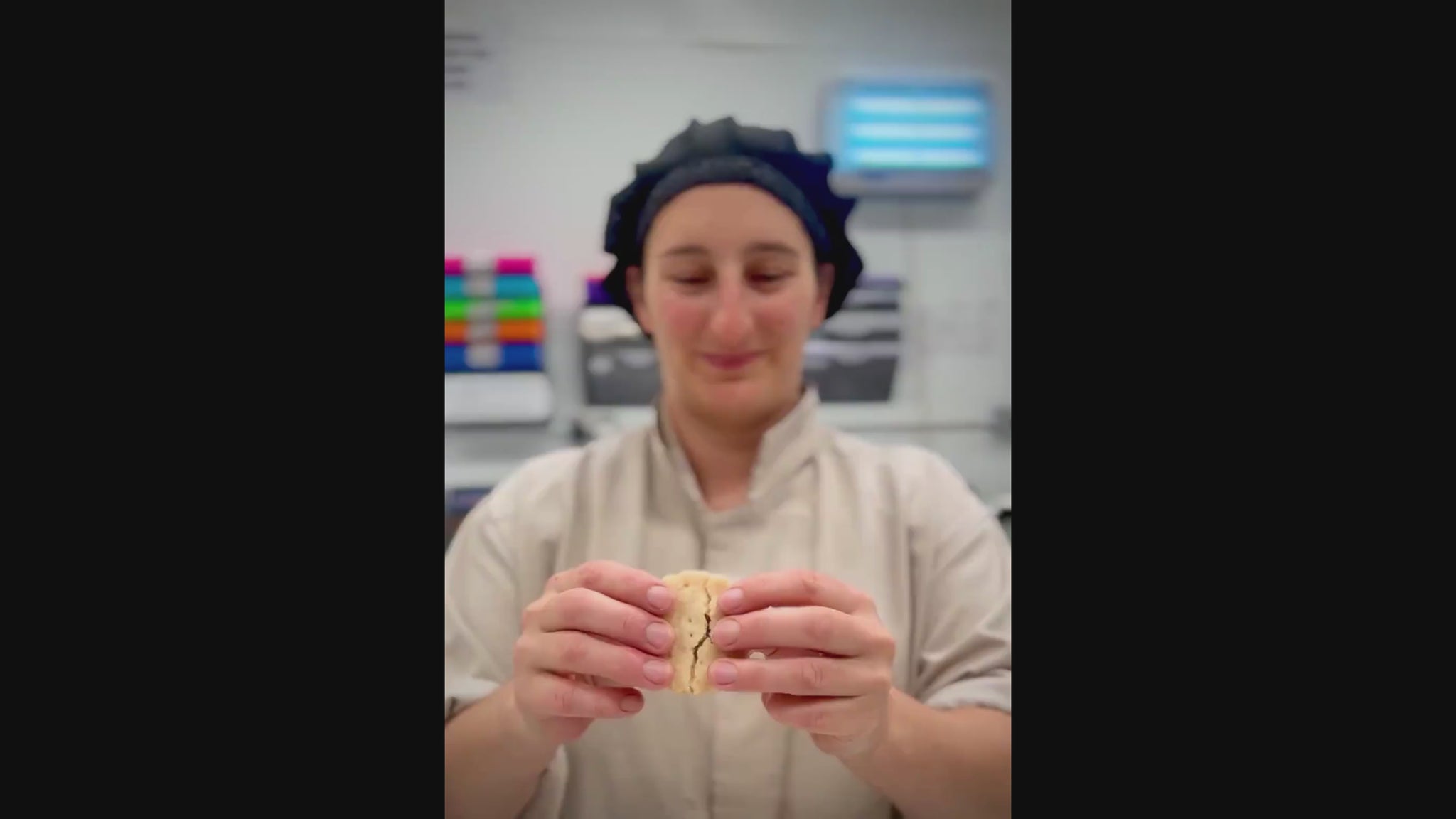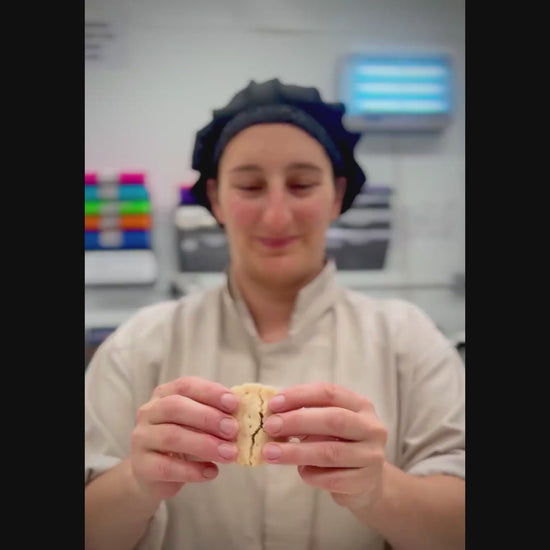 Plant-Based dark chocolate mousse with a praline-caramel and roasted hazelnut centre, on a crunchy biscuit base, sprayed with a dark chocolate glaze. Decorated with caramel and a gold buttercurlie.